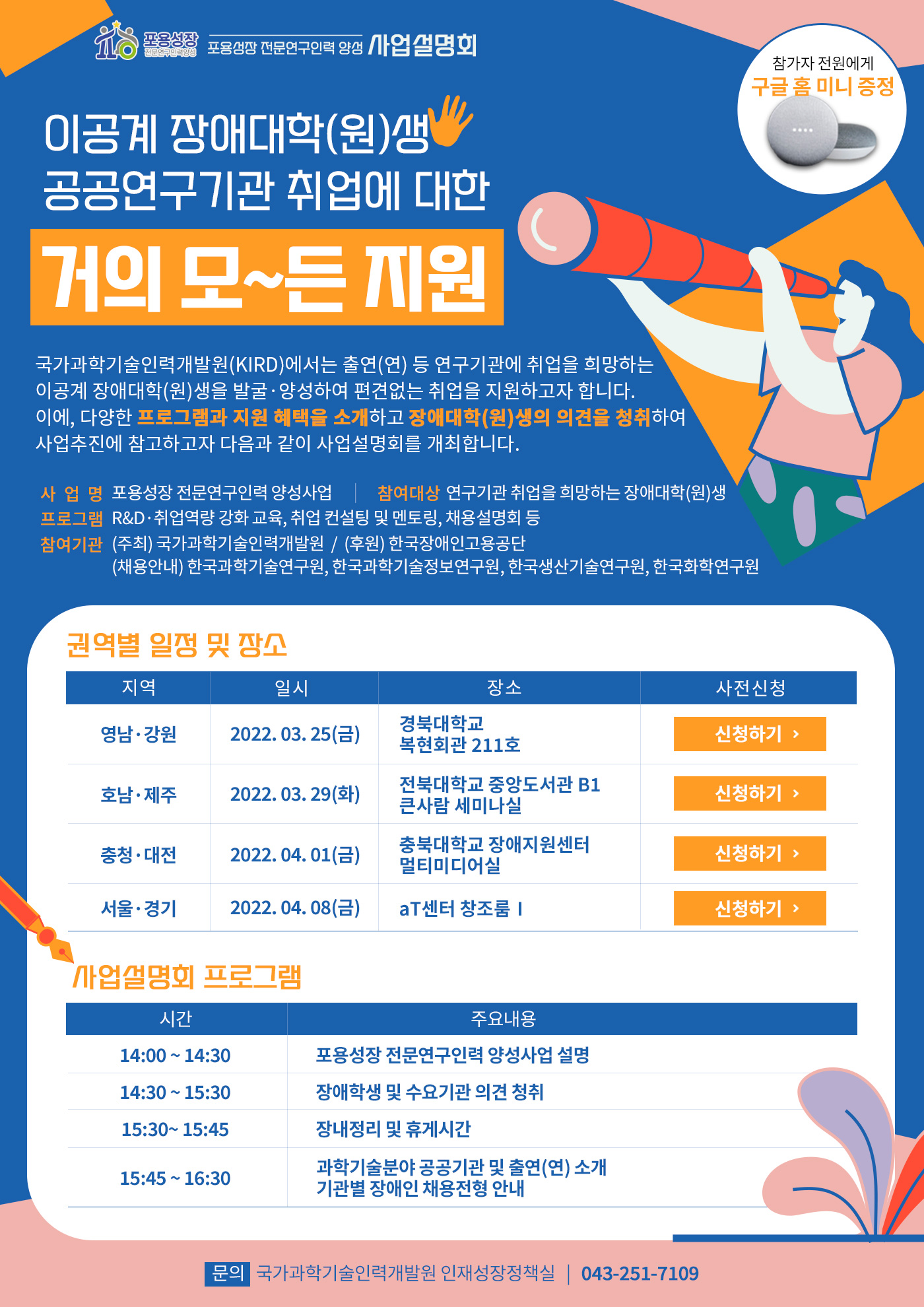 공공연구기관 취업을 희망하는 이공계 장애대학(원)생 여러분들의 소중한 의견을 듣는 자리이니 많은 참여바랍니다.