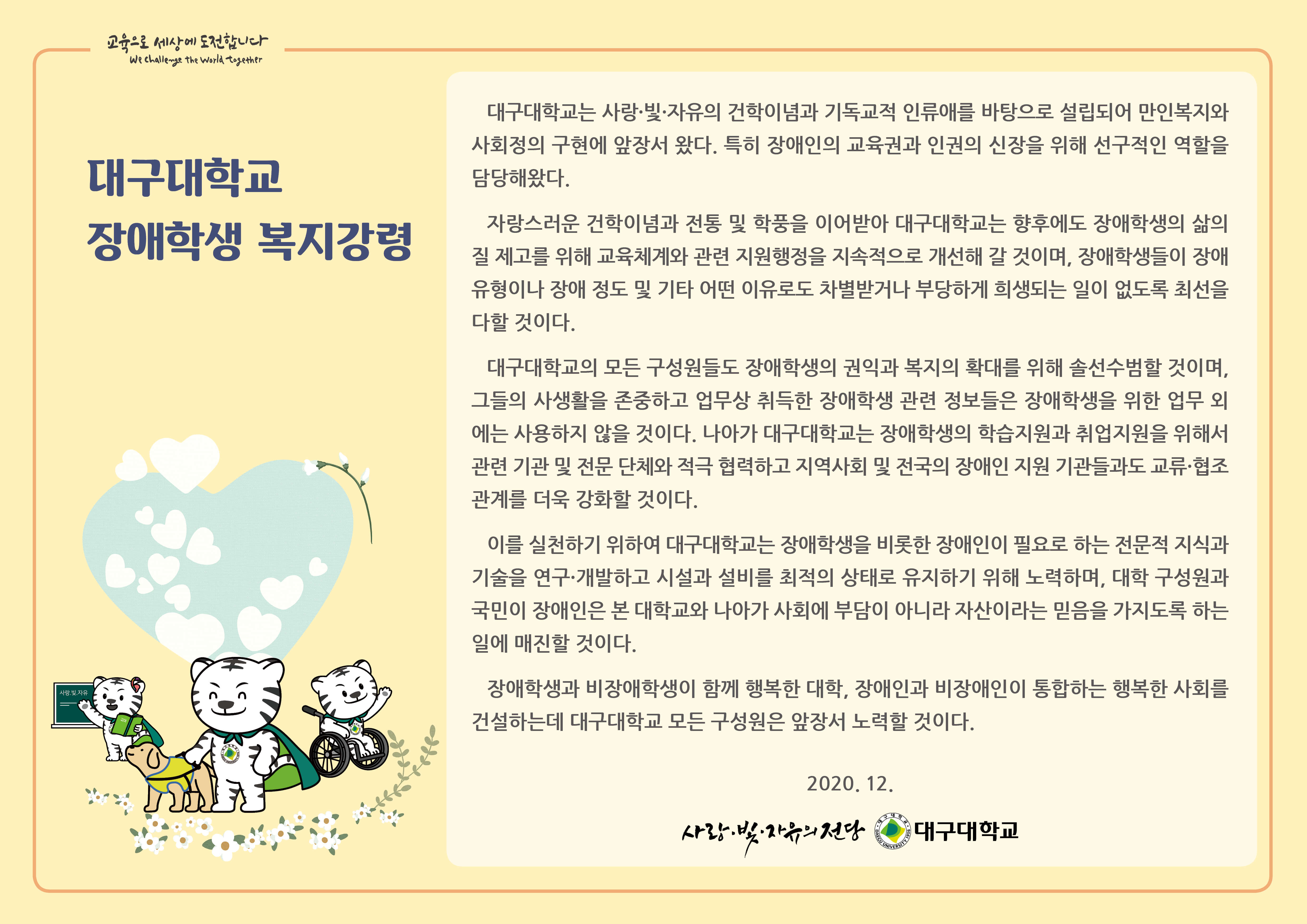 장애학생과 비장애학생이 함께 행복한 대학, 장애인과 비장애인이 통합하는 행복한 사회를 건설하는데 대구대학교 모든 구성원은 앞장서 노력할 것이다.
