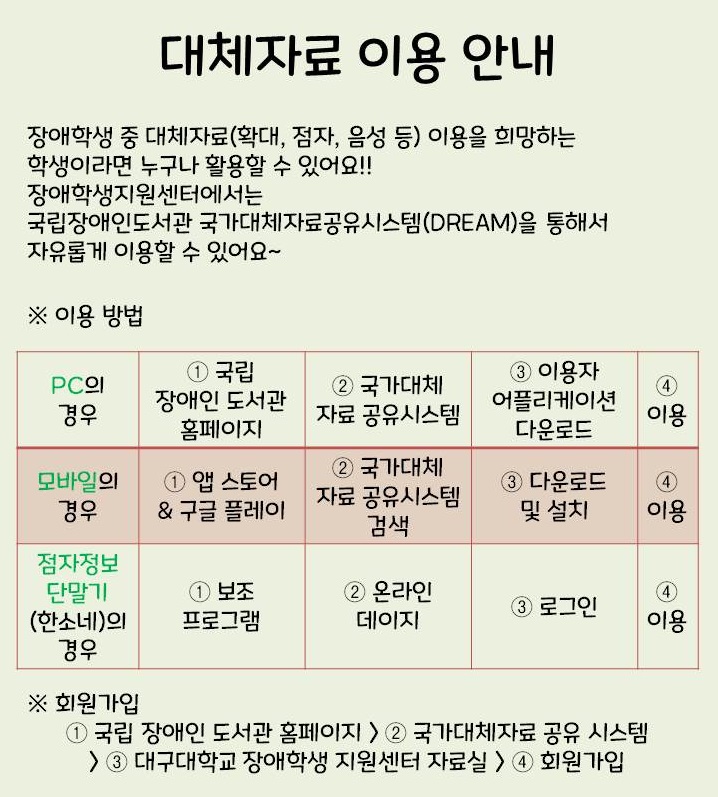 장애학생지원센터에서는 국립장애인도서관 국가대체자료공유시스템(DREAM)을 통해서 PC, 모바일, 점자정보단말기를 이용해서 자유롭게 이용할 수 있어요.