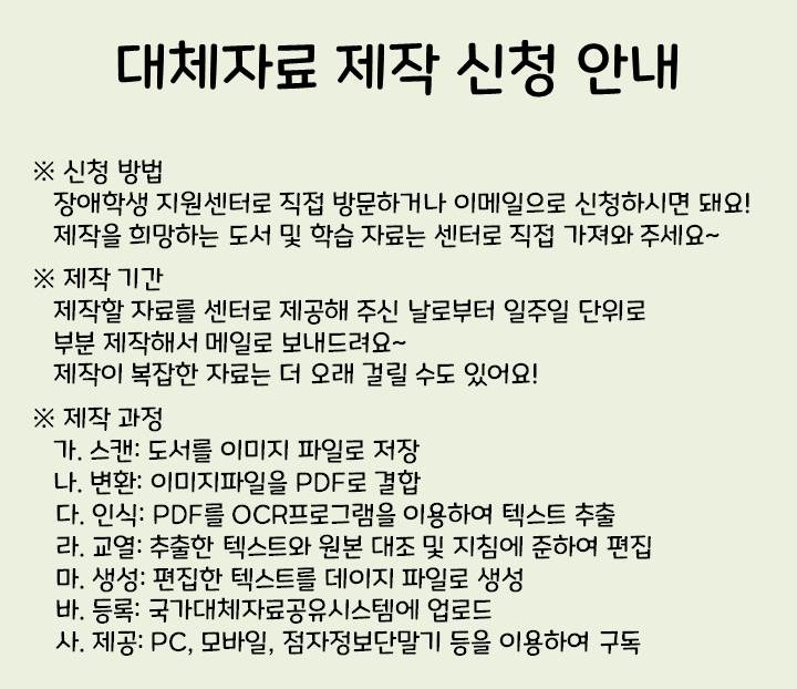 제작을 희망하는 도서 및 학습 자료는 센터로 직접 가져와 주세요.