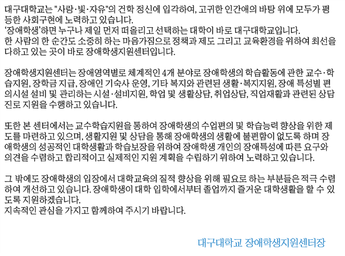 ‘장애학생‘하면 누구나 제일 먼저 떠올리고 선택하는 대학이 바로 대구대학교 입니다.